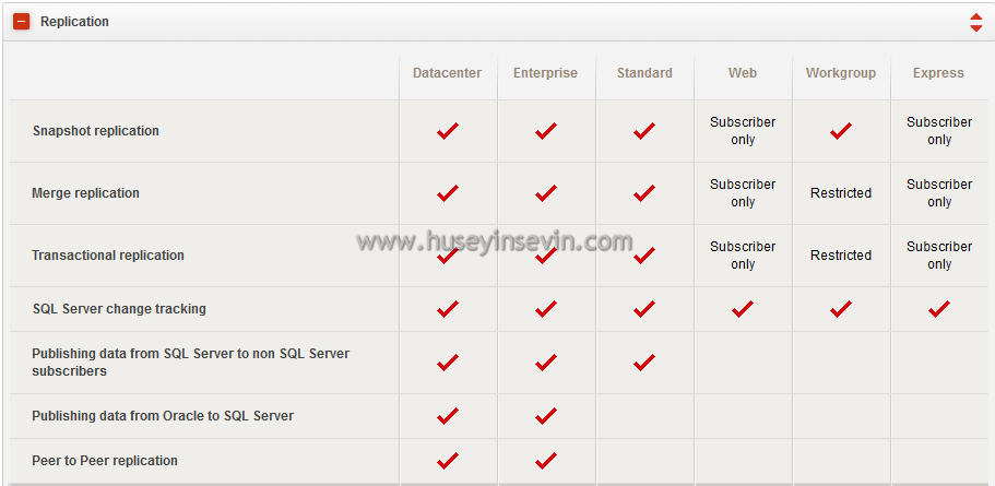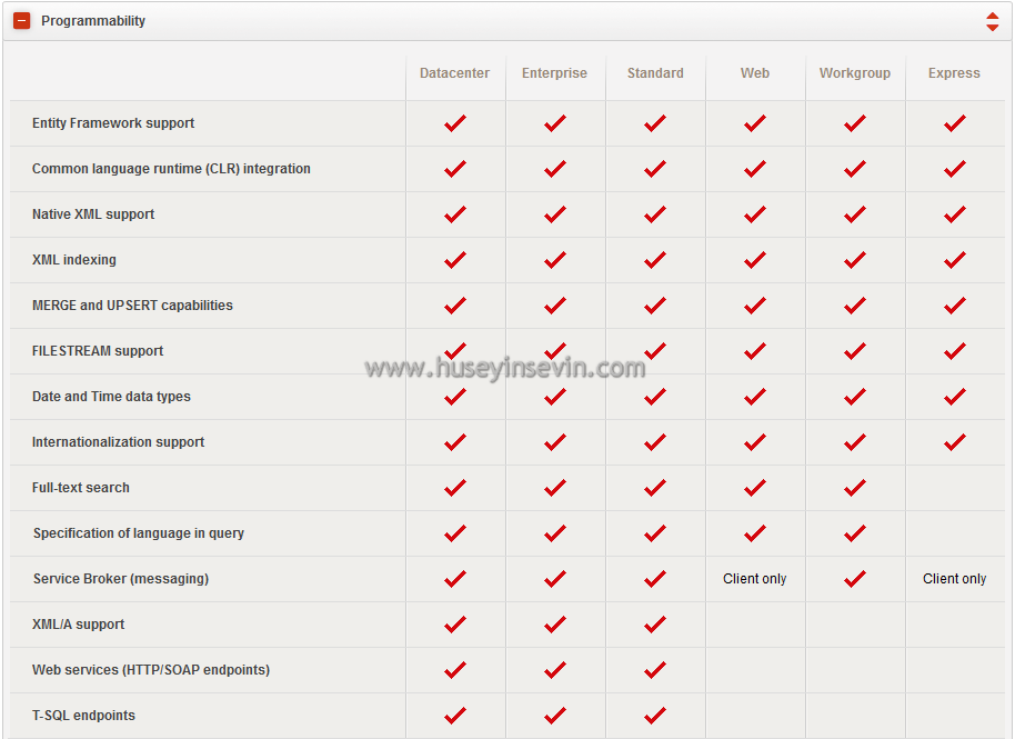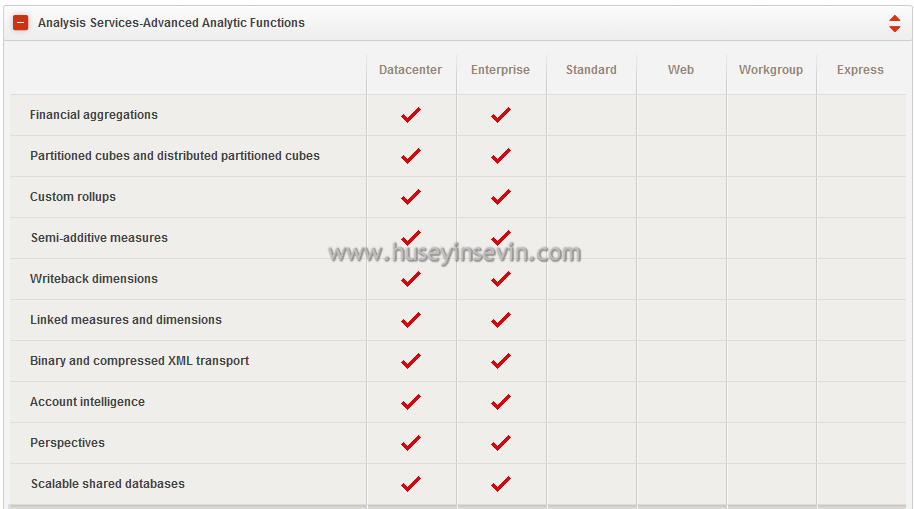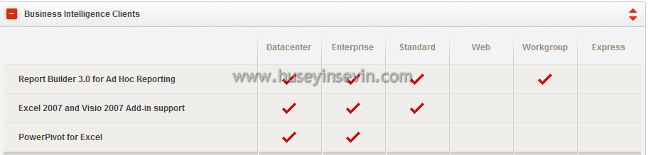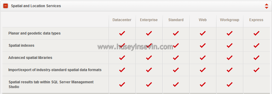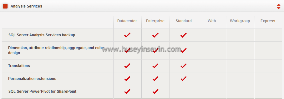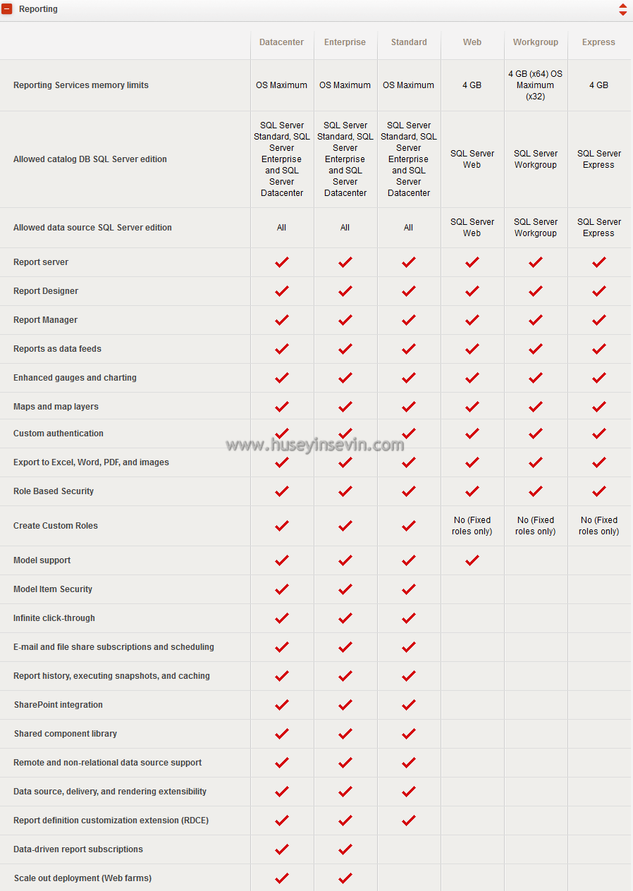 MSSQL 2008 R2 veritabanı sunucusunun sürümleri arasındaki farklılıklara aşağıda yer alan tablolardan bakabilirsiniz.