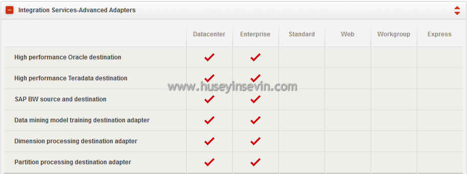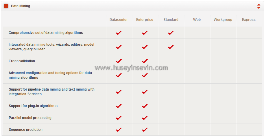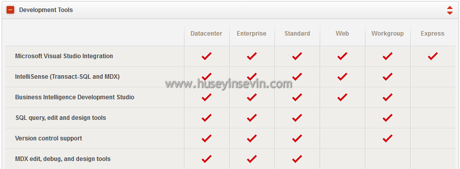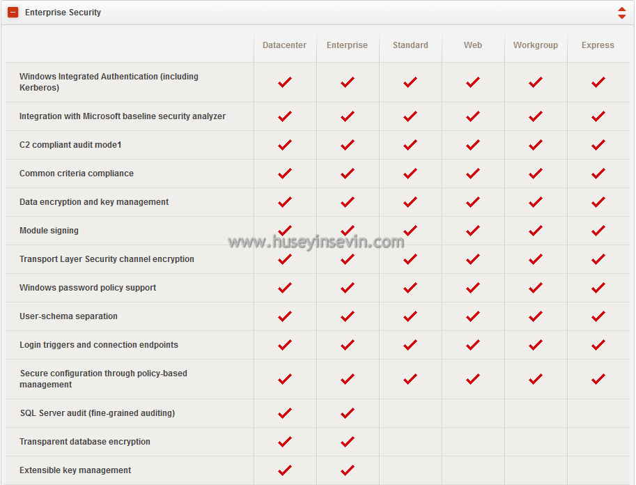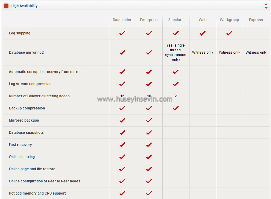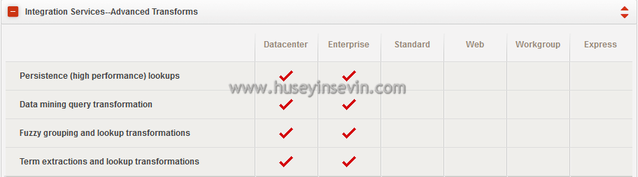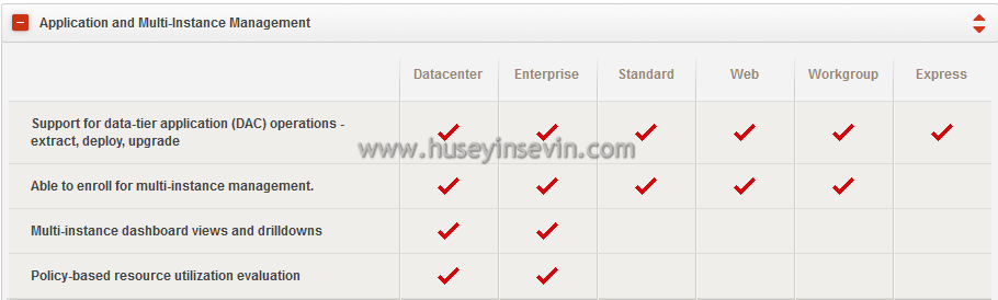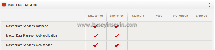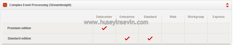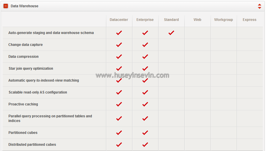 MSSQL 2008 R2 veritabanı sunucusunun sürümleri arasındaki farklılıklara aşağıda yer alan tablolardan bakabilirsiniz.